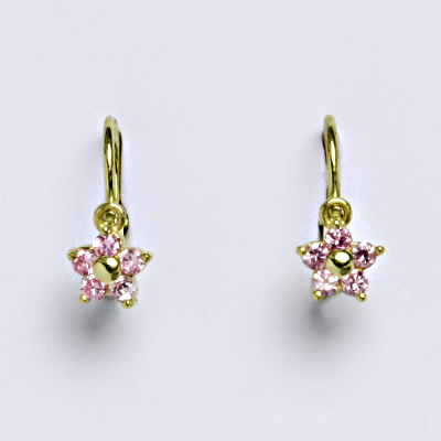 Dětské náušnice ze žlutého zlata s růžovými zirkony. Celková výška náušnice je 13 mm. Materiál je zlato 585/1000.Orientační váha páru dětských náušnic je 1,03 g.