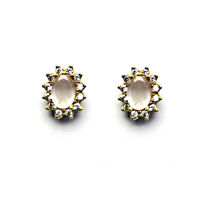 Zlaté náušnice zdobí přírodní růženín 7 x 5 mm, po jehož obvodu jsou zasazeny drobné zirkonky čiré barvy. Náušničky mají zapínání na šroubek a velmi pohodlně se nosí. Šperk působí velice jemným dojmem a perfektně sedí ženám všech věkových kategorií. Orientační hmotnost náušnic je 3,1 g. Vyhotoveno ze žlutého zlata ryzosti 585/1000.