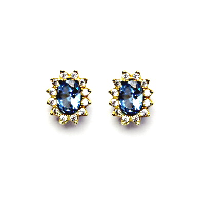Zlaté náušnice zdobí syntetický tmavý akvamarin 7 x 5 mm, po jehož obvodu jsou zasazeny drobné zirkonky čiré barvy. Náušničky mají zapínání na šroubek a velmi pohodlně se nosí. Šperk působí velice jemným dojmem a perfektně sedí ženám všech věkových kategorií. Orientační hmotnost náušnic je 3,1 g. Vyhotoveno ze žlutého zlata ryzosti 585/1000.
