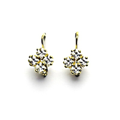 Zlaté náušnice se zapínáním na klasický patent, zdobené čtyřmi čirými zirkonky velikosti 3 x 3 mm. Rozměry zdobné části jsou 8 x 8 mm, celková výška náušnice 15 mm. Orientační hmotnost šperku je 2,45 g. Vyhotoveno ze žlutého zlata ryzosti 585/1000.