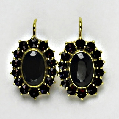 Náušnice ze žlutého zlata jsou zdobeny přírodními granáty. Středový granát má rozměr 11x6mm a okolní mají průměr 3 mm. Materiál je zlato 585/1000. Orientační váha je 8,51 g. Zapínání je na patent.