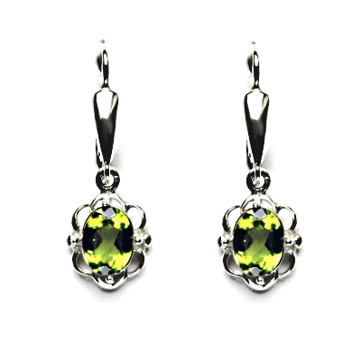 Zlaté náušnice s přírodním kamenem olivín velikosti 8x6 mm. Náušnice se zapínají na klasický patent, jejich celková výška je 30 mm, rozměry zdobné části 11x5 mm. Orientační hmotnost šperku 3,56 g. Náušnice jsou vyhotoveny z bílého zlata ryzosti 585/1000.