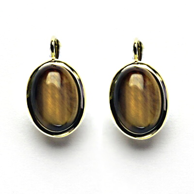 Zlaté náušnice s přírodními kameny tygří oko velikosti 14x10 mm, zapínání na klasický patent. Celková výška náušnic je 23 mm, šířka zdobné části 13 mm, orientační hmotnost 5,3g a více. Vyhotoveno ze žlutého zlata ryzosti 585/1000.