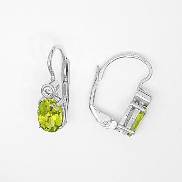 Diamantové náušnice s přírodními olivíny vyrobené z bílého zlata 585/1000. Velikost diamantů je 2,25 mm celkem cca 0,09 ct v kvalitě VS/G.