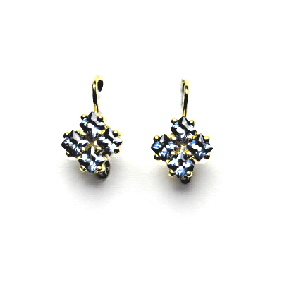 Zlaté náušnice se zapínáním na klasický patent, zdobené čtyřmi zirkony v barvě akvamarinu - velikost 3 x 3 mm. Rozměry zdobné části jsou 8 x 8 mm, celková výška náušnice 15 mm. Orientační hmotnost šperku je 2,45 g. Vyhotoveno ze žlutého zlata ryzosti 585/1000.
