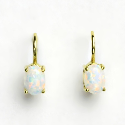 Dámské náušnice jsou zdobeny syntetickým bílým opálem o rozměru 7x5 mm a jsou vyrobeny ze žlutého zlata. Materiál je zlato 585/1000. Celková výška náušnice je 15 mm. Náušnice mají zapínání na klapku. Orientační váha náušnic je 1,81 g.