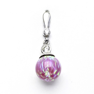 Zlatý přívěsek s růžovým syntetickým opálem o průměru 10 mm, přizdobený dvěma čirými zirkony velikosti 2 mm. Celková výška přívěsku je 28 mm, orientační hmotnost 2 g. Vyhotoveno z bílého zlata ryzosti 585/1000.
