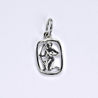 Zlatý přívěšek znamení zvěrokruhu střelec. Celková výška přívěšku je 17 mm. Orientační váha přívěsku je 0,61 g. Materiál je 14 karátové bílé zlato 585/1000.