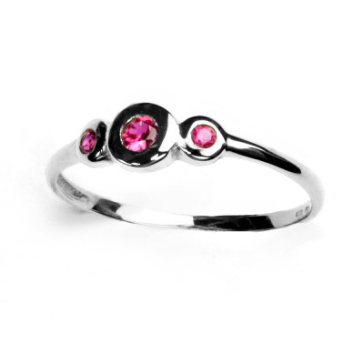 Zlatý prsten zdobený třemi zirkony barvy rubín, bílé zlato 585/1000. Průměr většího kamínku je 3 mm, menší měří 2 mm. Orientační hmotnost prstene ve velikosti 60 je cca 1,40 g.