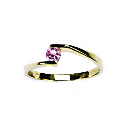 Zlatý zásnubní prsten zdobený růžovým zirkonem o průměru 4 mm, dostupný v široké škále velikostí včetně dětských a nadměrných. Prsten svým osobitým designem zaujme na první pohled, je elegantní a navzdory své jemnosti velmi výrazný. Vyhotoveno ze žlutého zlata ryzosti 585/1000, orientační hmotnost 2,3 g.