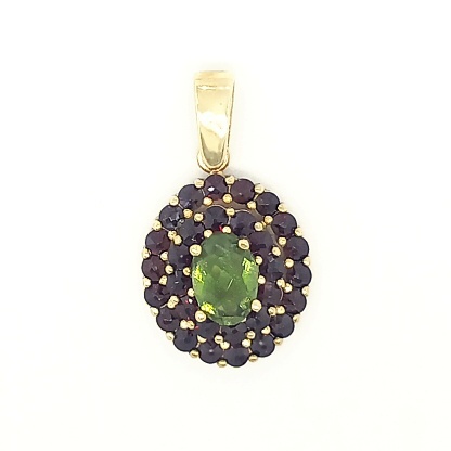 Zlatý přívěsek, přírodní vltavín a přírodní granáty , žluté zlato - 2,93 g