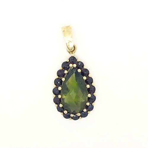 Zlatý přívěsek slza, přírodní vltavín a přírodní granáty , žluté zlato - 3,46 g